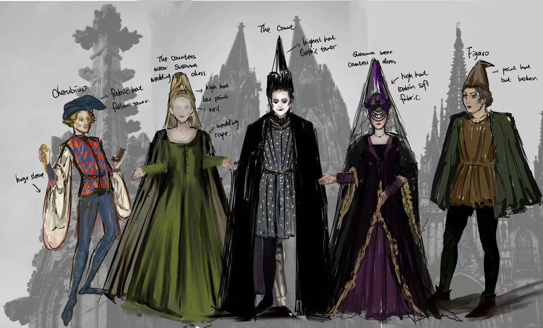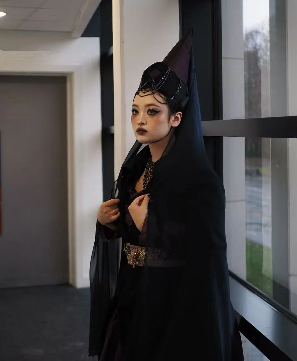 Grounded in High Gothic aesthetics, architectural structure is translated into costume through elongated proportions and distorted forms, reflecting both hierarchy and its dissolution.